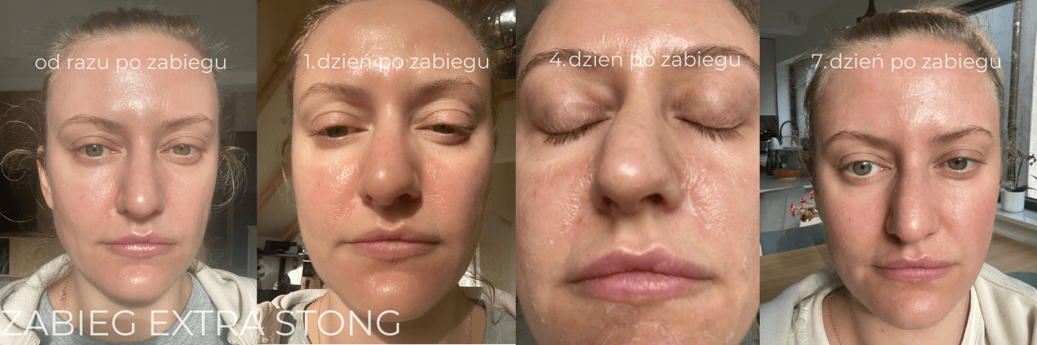I Peel Extra Strong to połączenie I Peel Advanced BHA Lift o stężeniu 20% i pH 2,0-2,5 oraz I Peel Perfection Lift składającego się z 5% kwasu salicylowego, rezorcyny, mlekowego o pH 2,0- 3,0 – poprzez intensywne wyłuszczenie skóry uruchamia powodują silne procesy naprawcze i produkcję nowych włókien kolagenu oraz elastyny.